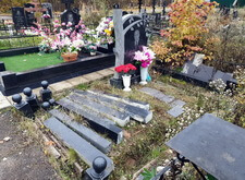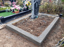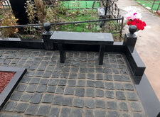 Завершающим этапом стала сборка оградки и укладка брусчатки. Ограждение мы создали из находившихся на могиле секций, кое где закрепив отломавшиеся навершия на разделительные столбики. Перед памятником мы установили гранитный цветник и две траурные урны, а по правую сторону от входа поставили заказанную клиентом лавочку, тоже изготовленную из чёрного гранита. Брусчатку мы замыли водой, одновременно удаляя всю строительную пыль, образовавшуюся в процессе работы.