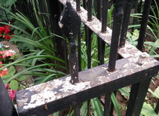 Это старая и мощная ограда. По словам клиентов ей более 60 лет. Достаточно длительный срок нижняя часть ограды находилась в земле, это ускорило коррозию металла, некоторые прутья разболтались, и задняя часть ограды провисла. Необходимо было отремонтировать ограду и покрасить ее.