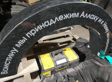 Далее начинается второй этап – переход к созданию элементов памятника. Первая подготовленная деталь – полукруглая арка. Трафарет на арку отпескоструили, сделали надпись сусальным серебром